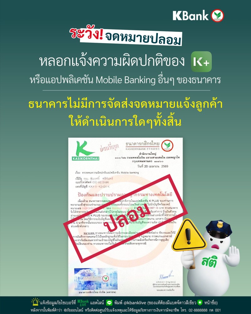 เมื่อวันที่ 21 เมษายน 2569 ที่ผ่านมา ธนาคารกสิกรไทย ออกประกาศผ่านเฟซบุ๊ก KBank Live แจ้งเตือนผู้ใช้บริการ ระวังมิจฉาชีพแอบอ้างเป็นธนาคาร ส่งจดหมายปลอมไปยังลูกค้า โดยอ้างว่าตรวจพบความผิดปกติของ K PLUS หรือแอปพลิเคชัน Mobile Banking อื่น ๆ เพื่อหลอกให้ดำเนินการตามขั้นตอนที่ระบุไว้