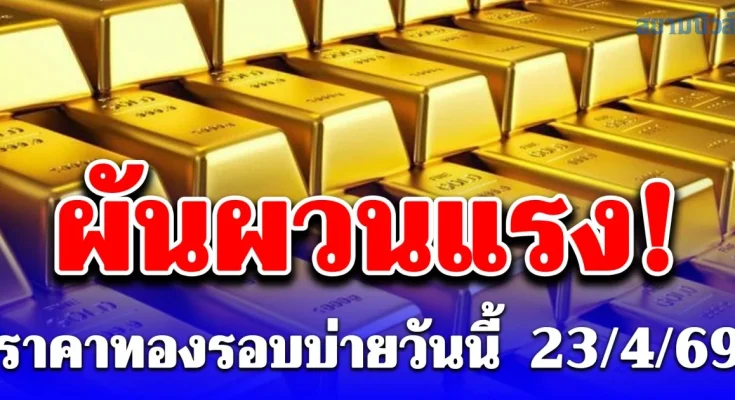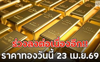 รายงานราคาทองคำในประเทศประจำวันพฤหัสบดีที่ 23 เมษายน 2569 ได้รับการประกาศครั้งแรก (เปิดตลาด) เมื่อเวลา 09.06 น. โดยราคาทองคำมีการปรับตัวลดลง 200 บาท ส่งผลให้ราคาซื้อขายเคลื่อนไหวอยู่ที่บริเวณ 72,450 บาท เมื่อเทียบกับการประกาศราคาซื้อขายครั้งสุดท้ายของเมื่อวาน (วันพุธ) ซึ่งตลอดทั้งวันมีการประกาศราคาทองคำรวม 11 ครั้ง และปรับตัวลดลงรวม 300 บาท มาอยู่ที่บริเวณ 72,450 บาทเช่นกัน