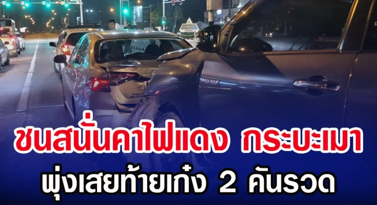 ชนสนั่นคาไฟแดง กระบะเมา พุ่งเสยท้ายเก๋ง 2 คันรวด