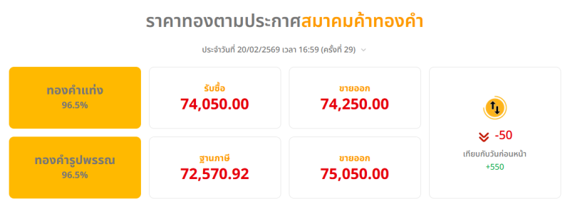 สรุปราคาทองวันนี้ 20 กุมภาพันธ์ 2569 สมาคมค้าทองคำ ประกาศราคาทองคำครั้งที่ 1 (เปิดตลาด) เมื่อเวลา 09.02 น. ปรับตัวขึ้น 50 บาท