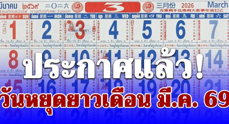 ใกล้เข้าสู่เดือนมีนาคม 2569 กันแล้ว หลายคนเริ่มมองหาวันลา วันหยุด วันหยุดยาวไปพักผ่อนช่วงต้นปี เพราะเดือนนี้มี วันหยุดพิเศษ 1 วัน วันนี้เราจะพามาดูว่า วันหยุดเดือนมีนาคม 2569 มีวันไหนบ้าง