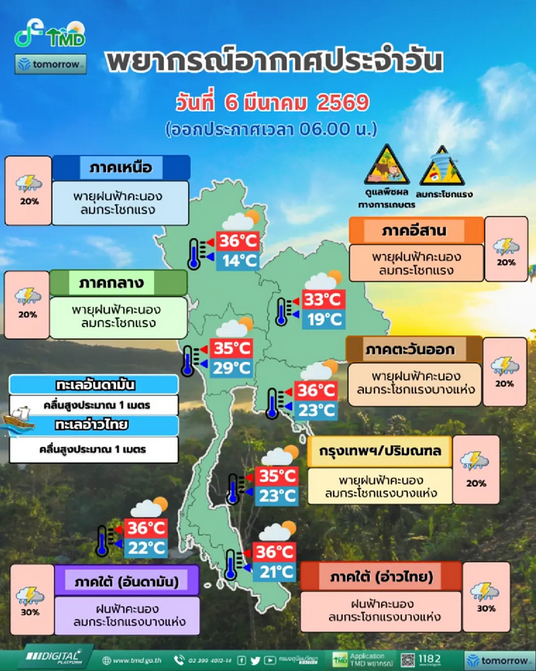 พยากรณ์อากาศสำหรับประเทศไทย 06:00 น. วันนี้ ถึง 06:00 น. วันพรุ่งนี้