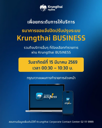 ธนาคารกรุงไทย เปิดเผยว่าเพื่อยกระดับการให้บริการ ธนาคารขอแจ้งปิดปรับปรุงระบบ Krungthai BUSINESS รวมถึงบริการอื่นๆ ที่ต้องเลือกทำรายการผ่าน Krungthai BUSINESS ในวันอาทิตย์ที่ 15 มีนาคม 2569 เวลา 00.30 – 10.30 น. กรุณาวางแผนการทำรายการล่วงหน้า