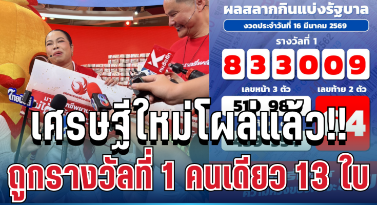 วันที่ 16 มีนาคม 2569 การออกรางวัลสลากกินแบ่งรัฐบาลงวดล่าสุดได้เสร็จสิ้นลงเป็นที่เรียบร้อย ท่ามกลางความลุ้นระทึกของประชาชนทั่วประเทศ โดยมีผู้โชคดีรายใหม่กลายเป็นเศรษฐีรับโชคก้อนโตจากงวดนี้