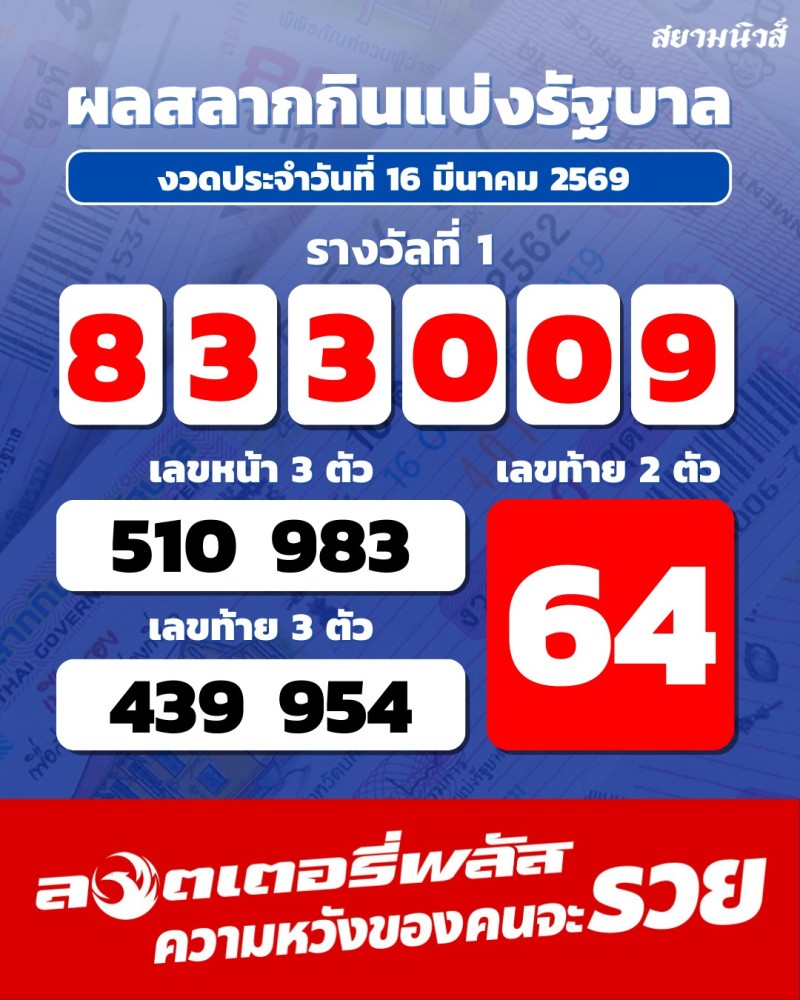 สำหรับผลการออกรางวัลสลากกินแบ่งรัฐบาล ประจำวันที่ 16 มีนาคม 2569 มีรายละเอียดดังนี้