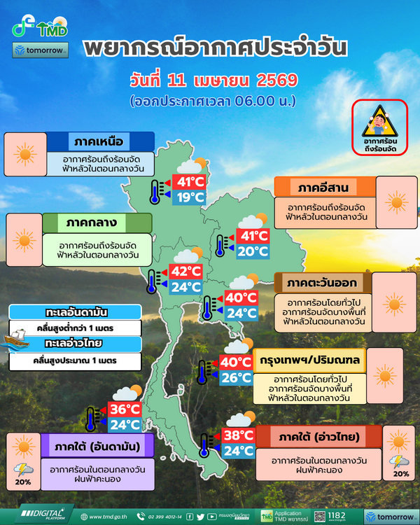 11 เมษายน 2569  พยากรณ์อากาศ 24 ชั่วโมงข้างหน้า ประเทศไทยตอนบนมีอากาศร้อนโดยทั่วไปและมีอากาศร้อนจัดบางพื้นที่ กับมีฟ้าหลัวในตอนกลางวัน เนื่องจากความกดอากาศต่ำ เนื่องจากความร้อนปกคลุมประเทศไทยตอนบน ขอให้ประชาชนดูแลรักษาสุขภาพเนื่องจากสภาพอากาศที่ร้อนถึงร้อนจัด โดยหลีกเลี่ยงการทำงานหรือการประกอบกิจกรรมในที่โล่งแจ้งเป็นระยะเวลานาน