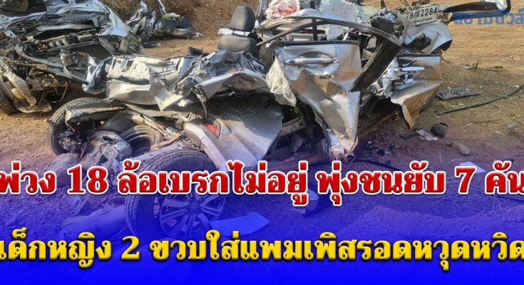 จากการสอบสวนเบื้องต้นทราบว่า รถพ่วง 18 ล้อขับมาด้วยความเร็วสูง เมื่อมาถึงจุดเกิดเหตุไม่สามารถเบรกได้ทัน พุ่งชนรถที่จอดอยู่ด้านหน้าอย่างแรง ส่งผลให้รถหลายคันถูกอัดก็อปปี้และกระเด็นไปคนละทิศละทาง